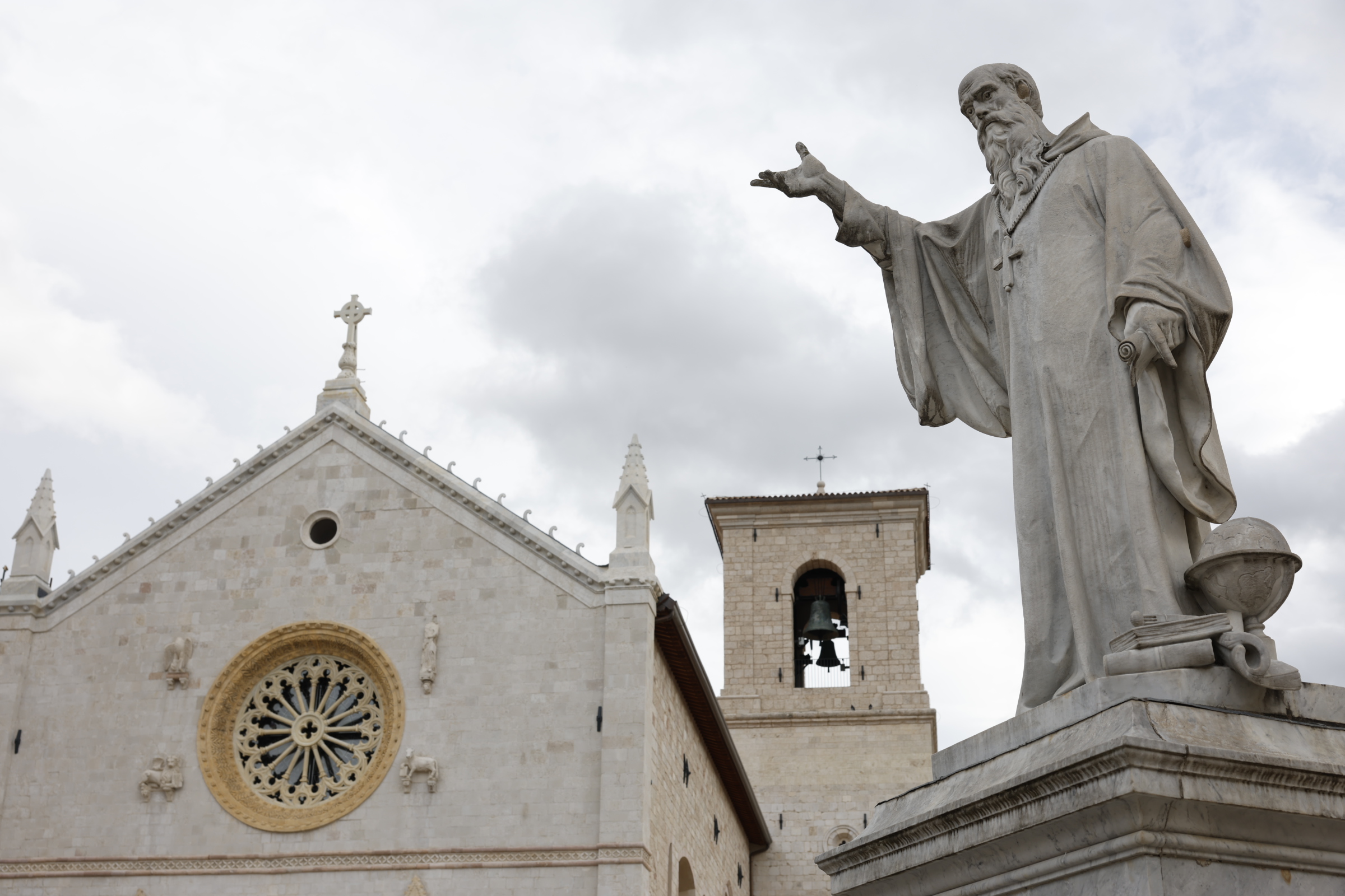 The facade of the Basilica and, on the right, the statue of San Benedetto da Norcia