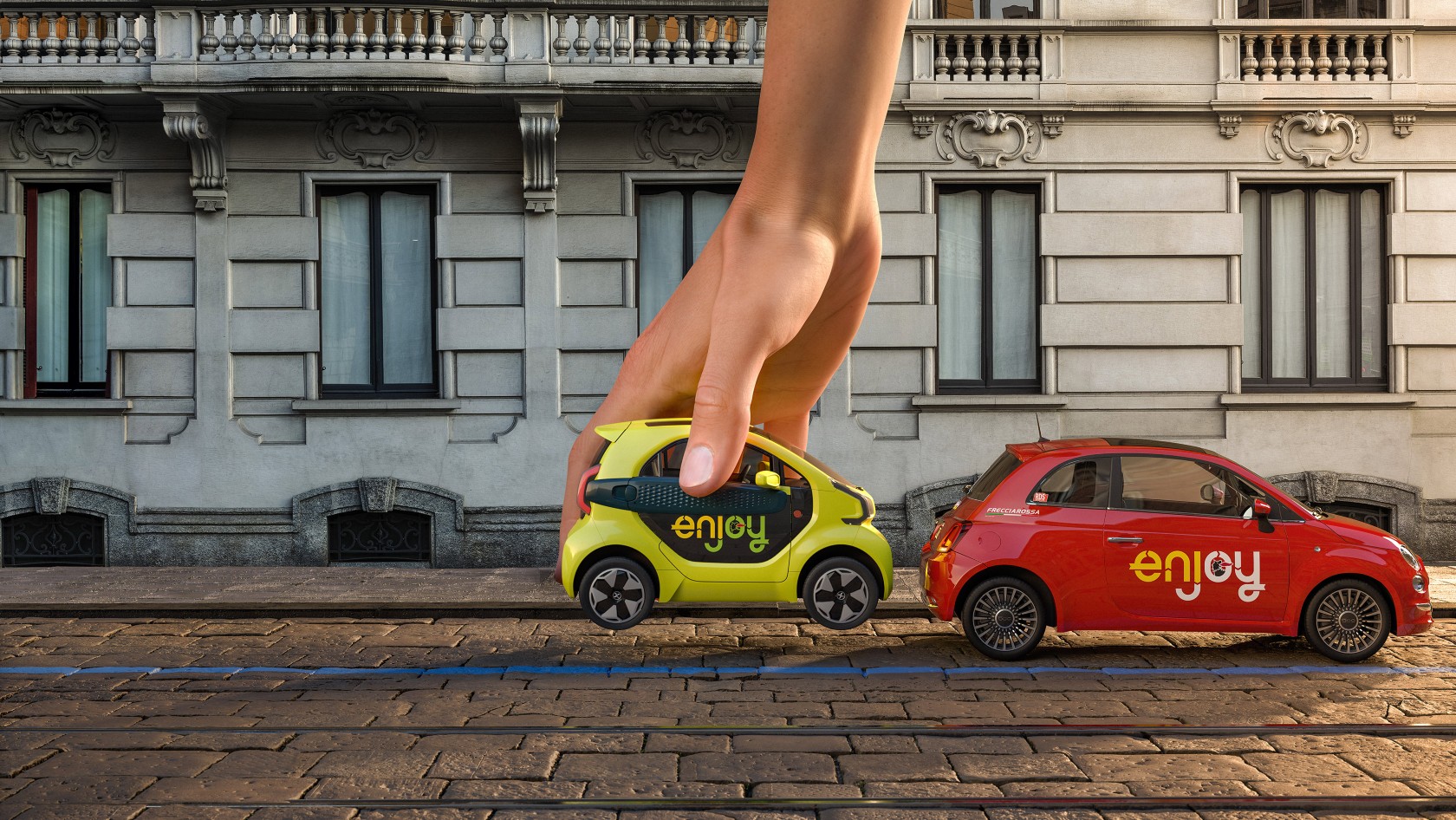 Rome, 13 June 2023 – Enjoy's Rome fleet becomes also electric. As of today, Eni Sustainable Mobility's car sharing service will have 100 new zero-emission city cars on the road in the unmistakable lime green colour. The electric cars contribute to Enjoy's fleet already available in the Italian capital, which consists of around 800 vehicles between cars and cargo and will expand to 200 over the next few months.