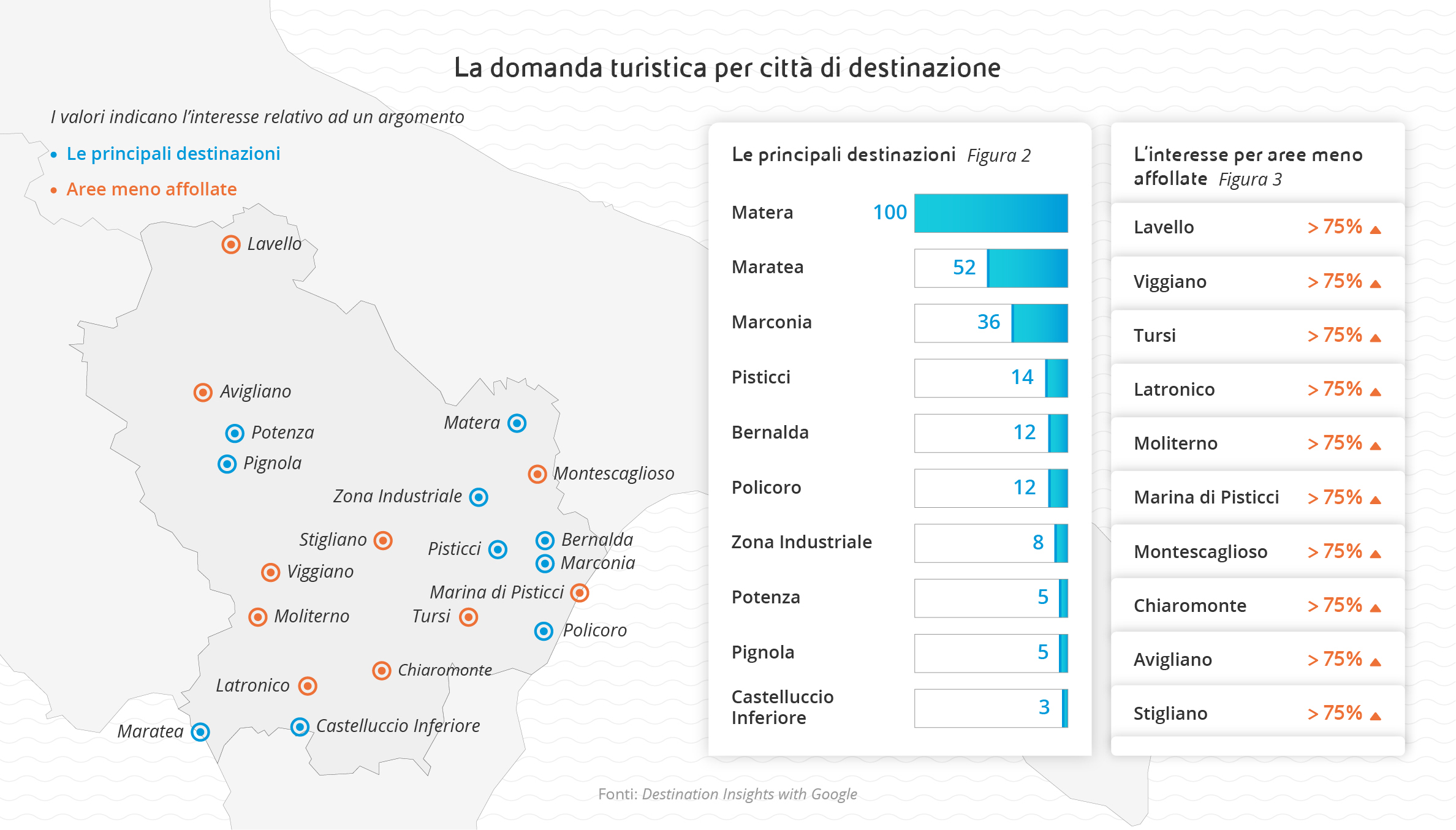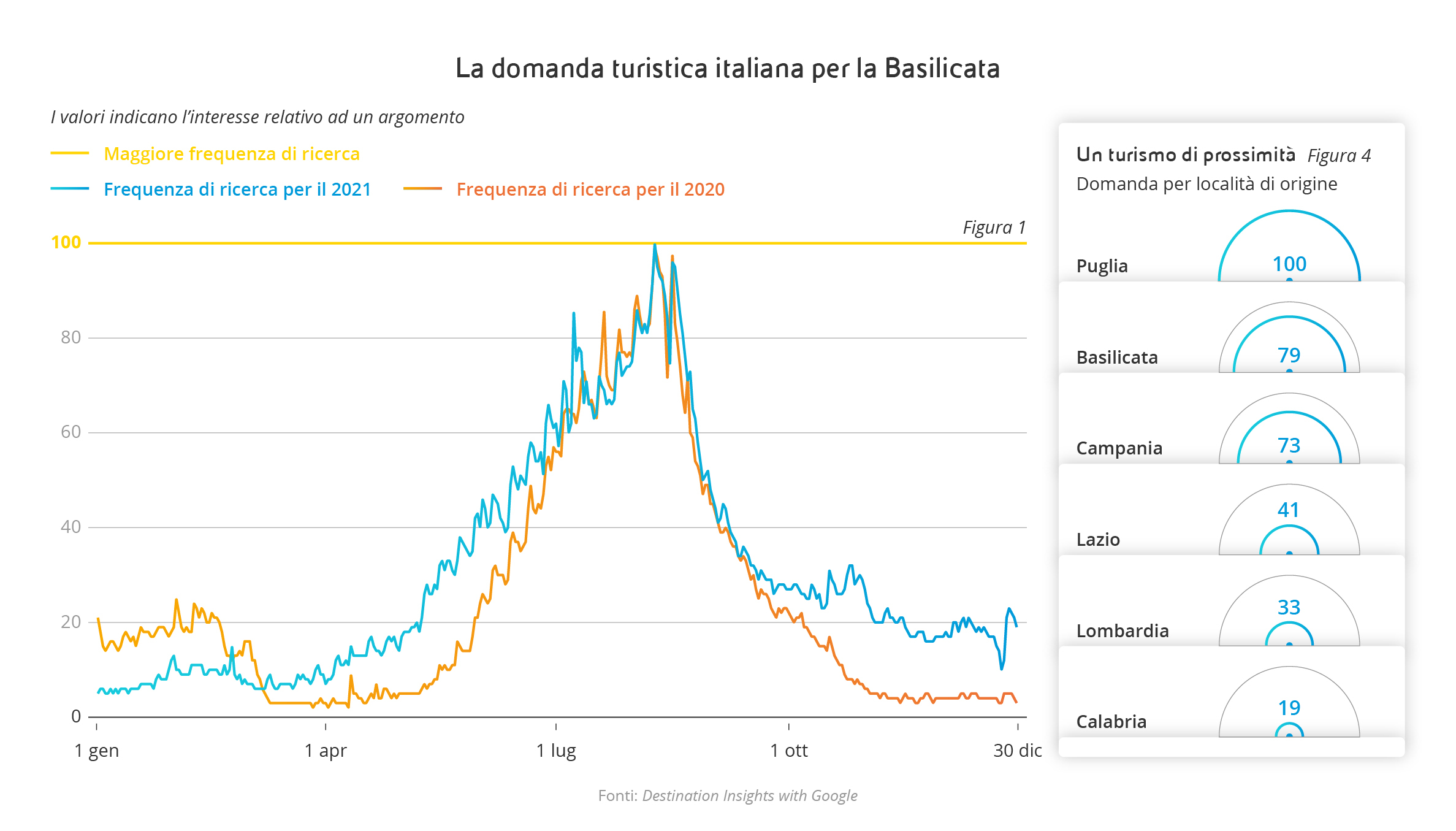 È quanto si può evincere analizzando come è cambiata la domanda turistica nel 2021 in Basilicata, utilizzando “Destination Insights” di Google, uno strumento che permette di esplorare il cambiamento della richiesta turistica nel tempo, di osservare le tendenze di viaggio permettendo così agli operatori turistici di prendere decisioni di business e di marketing sulla base di informazioni consultabili in tempo reale.