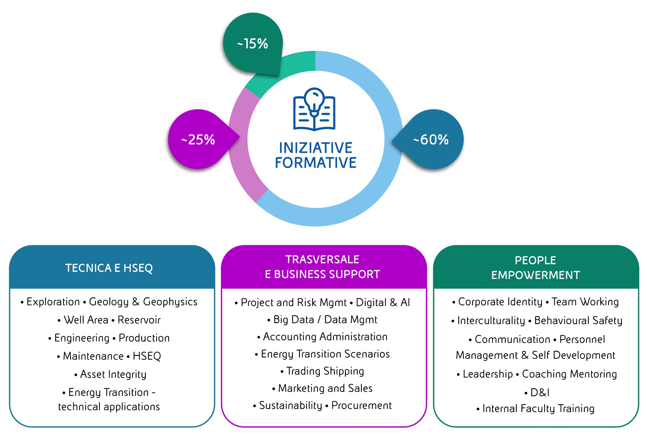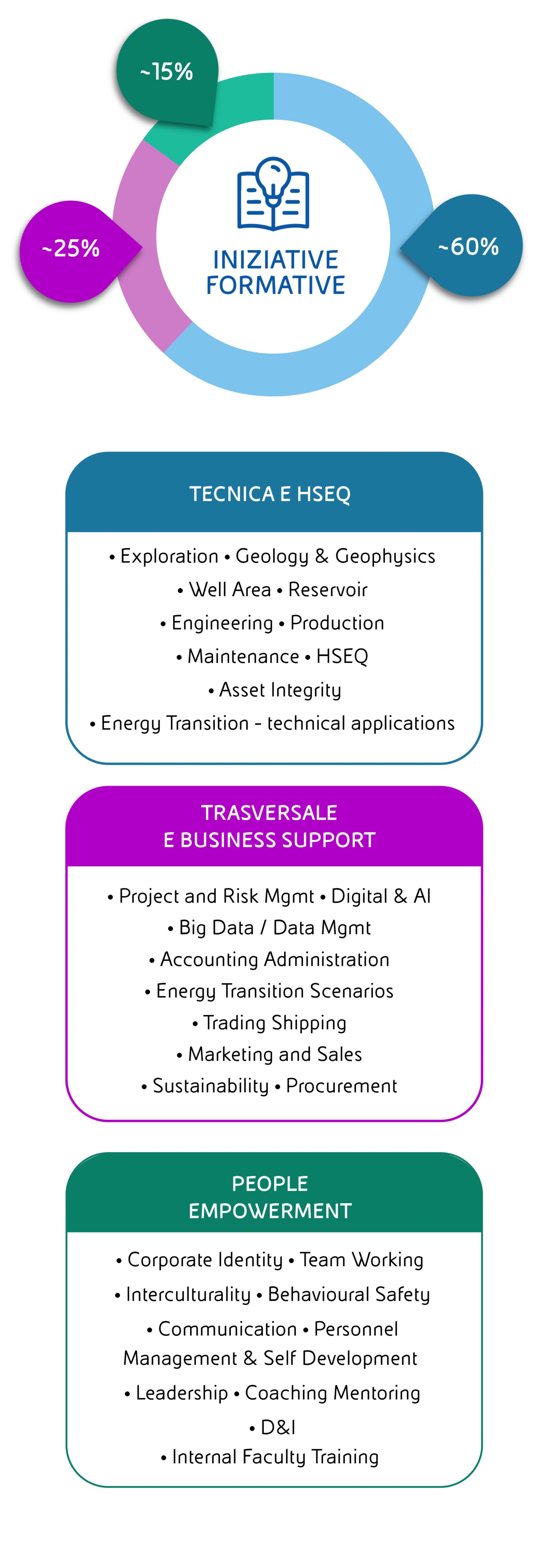 La formazione delle nostre persone rappresenta una leva fondamentale di successo strategico; per questo, collaboriamo strettamente con i nostri business, immaginando e definendo un ampio portfolio di corsi di formazione di ambito tecnico e HSEQ, trasversale e di people empowerment, in coerenza con le traiettorie strategiche di sviluppo Eni e utilizzando le metodologie più innovative.