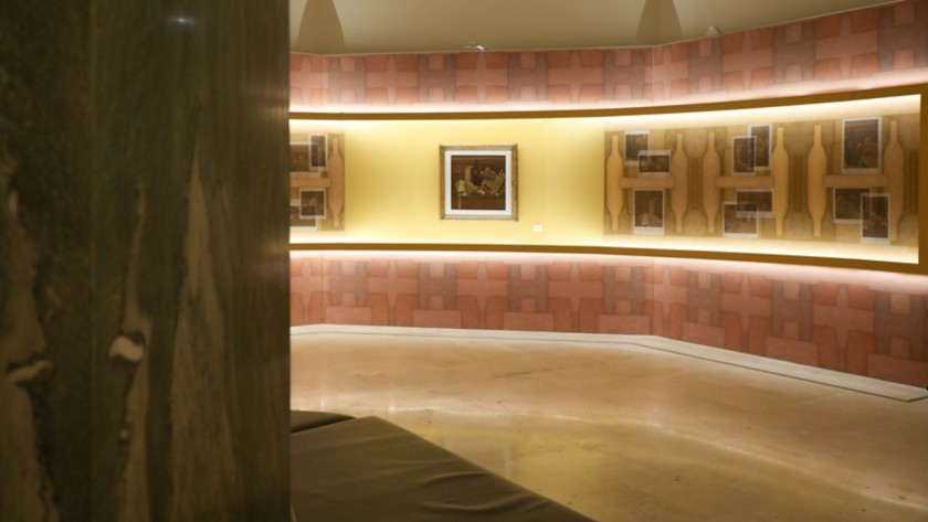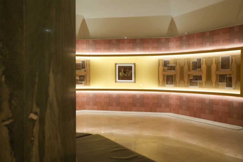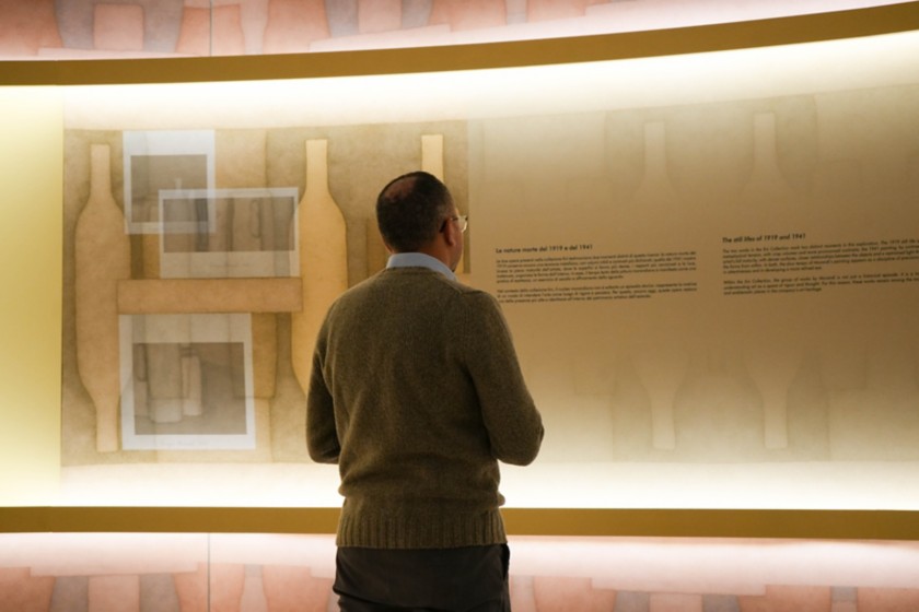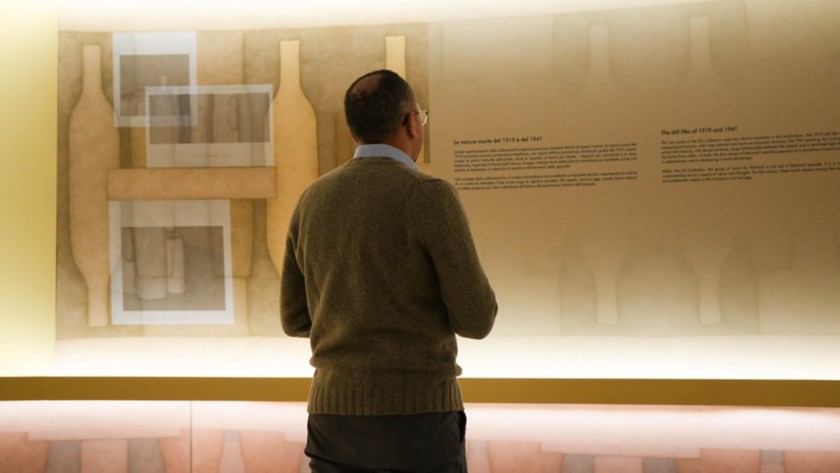 Il percorso si svolge all’interno della Sala Fontana le cui pareti, rivestite di una texture ispirata alle opere di Morandi, creano un’atmosfera di silenzio, luce e misura. In questo contesto, il visitatore vive due narrazioni parallele e complementari: da un lato, una sequenza di immagini e testi racconta la genesi della collezione, mentre il racconto delle due nature morte, restituisce valori e principi alla base deall’approccio imprenditoriale di Mattei.