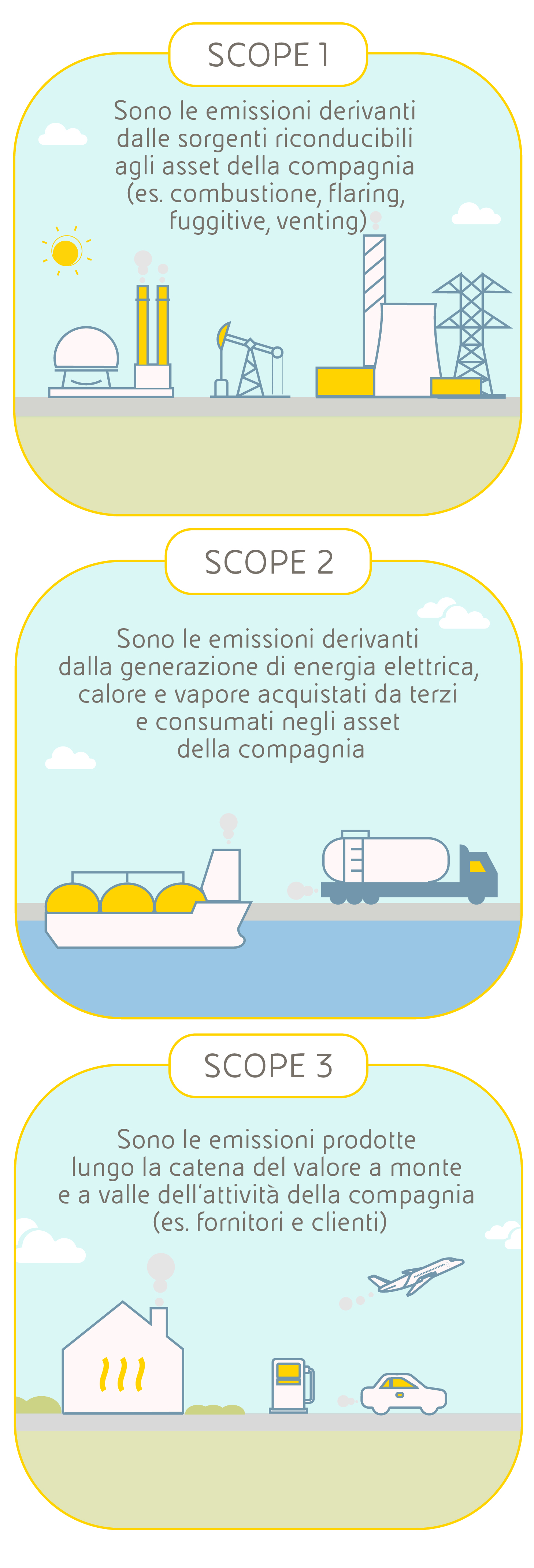 La prima riga principale si riferisce alle GHG Emissions e cioè alle emissioni di gas a effetto serra, questi KPI sono utilizzati nel Sustainability-Linked Financing Framework di Eni. Gli obiettivi includono solo la quota di CO₂ stoccata da Eni. Questa riga è composta da tre righe secondarie.