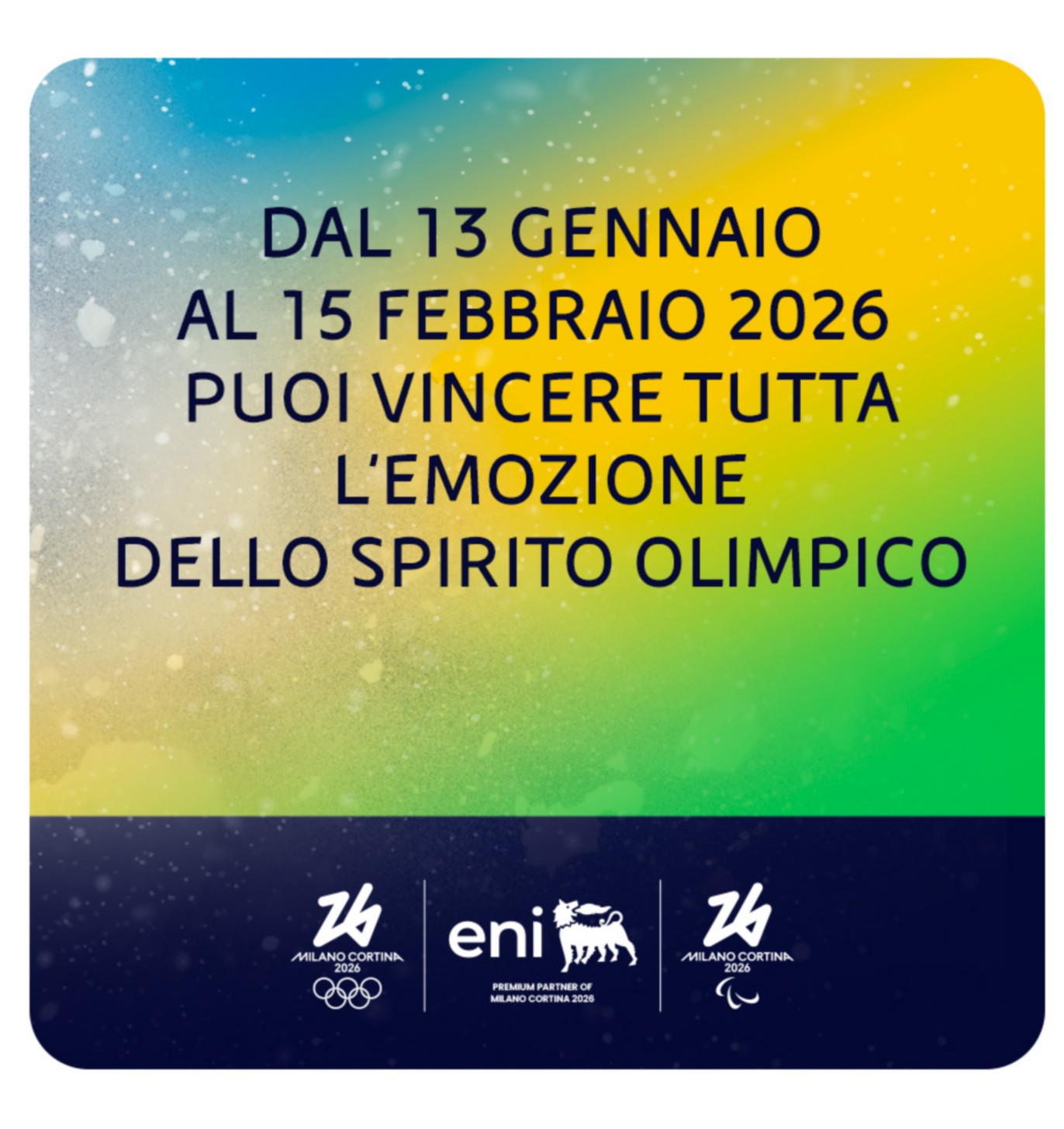 Partecipa al concorso per vincere i biglietti di Milano Cortina 2026. Potrai assistere alla cerimonia di apertura del 6 febbraio che si terrà allo stadio San Siro di Milano o a quella di chiusura del 22 febbraio all’Arena di Verona. Potrai essere tra i fortunati che vedranno dal vivo le gare di sci alpino maschile e femminile e dello sci di fondo, le competizioni di pattinaggio artistico, le discese di snowboard, l’hockey su ghiaccio e lo short track. Il concorso è attivo dal 13 gennaio al 15 febbraio. Consulta tutti i dettagli nel Regolamento*.